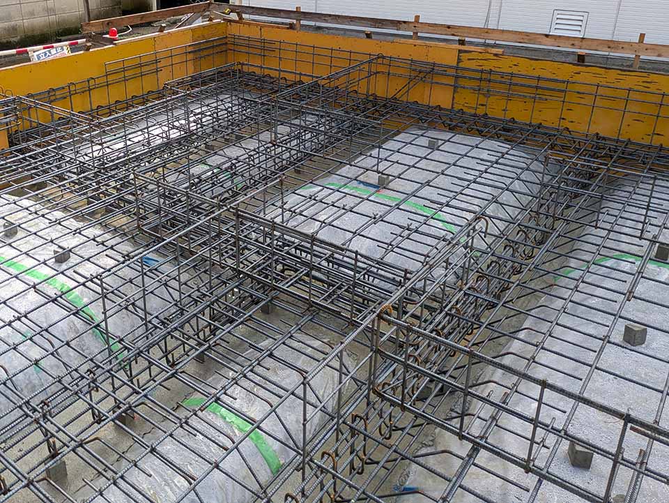 こちらが基礎鉄筋。コンクリートに鉄筋を埋め込みます。コンクリートは押される力に強く、引っ張られる力には弱い。一方で、鉄筋は押される力には弱いものの、引っ張られる力に強い。その両方を組み合わせて頑丈な基礎を作ります。コンクリートを流し込んで固まったら周りの木型は外されます。