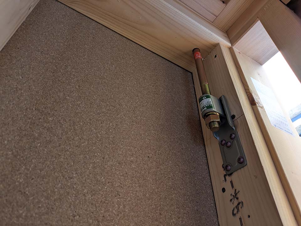 それぞれの柱には制震テープ。制震テープとは、粘り気と弾力のある素材を厚さ1mm、幅30mmほどに加工した、両面テープのようなものです。ごく薄いテープを貼るだけのシンプルな構造ですが、家全体で揺れを吸収して柔らかく分散します。劣化が極めて少なく、破損の心配がなく、従来の制震材よりも大きな効果を生むとともに、低コストです。