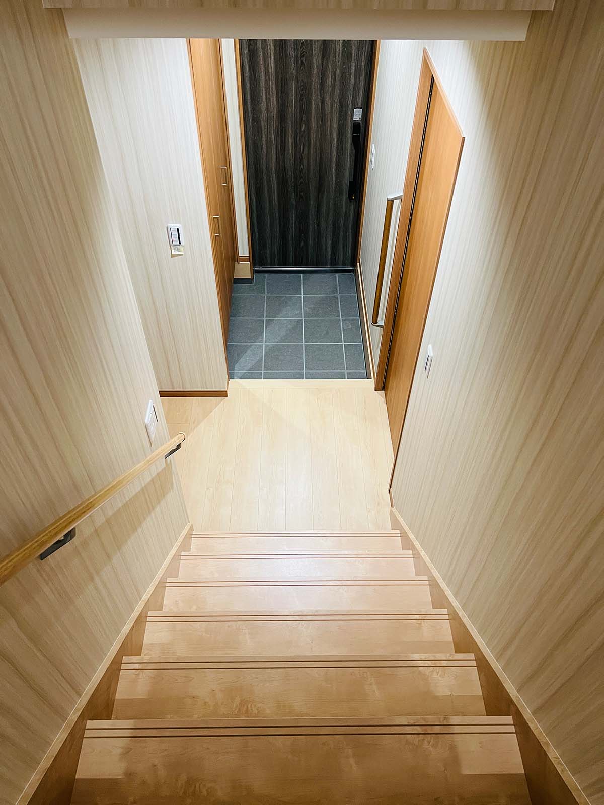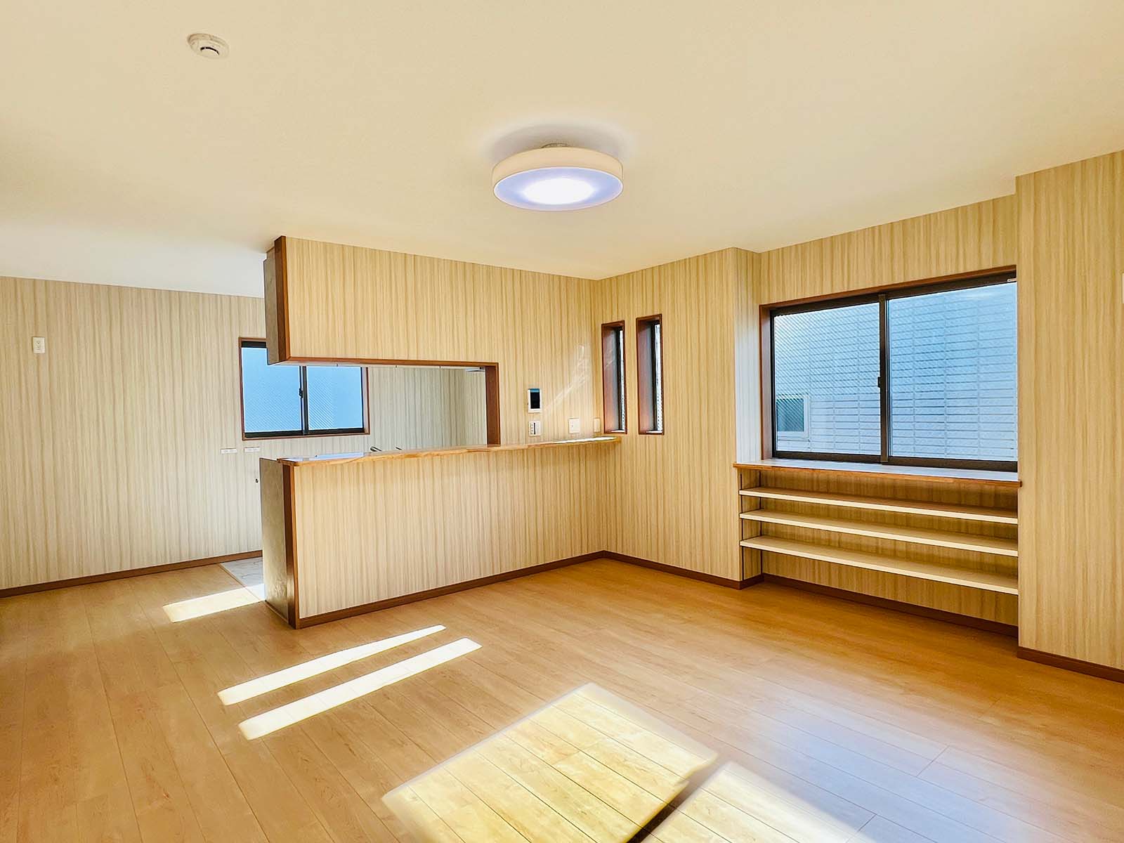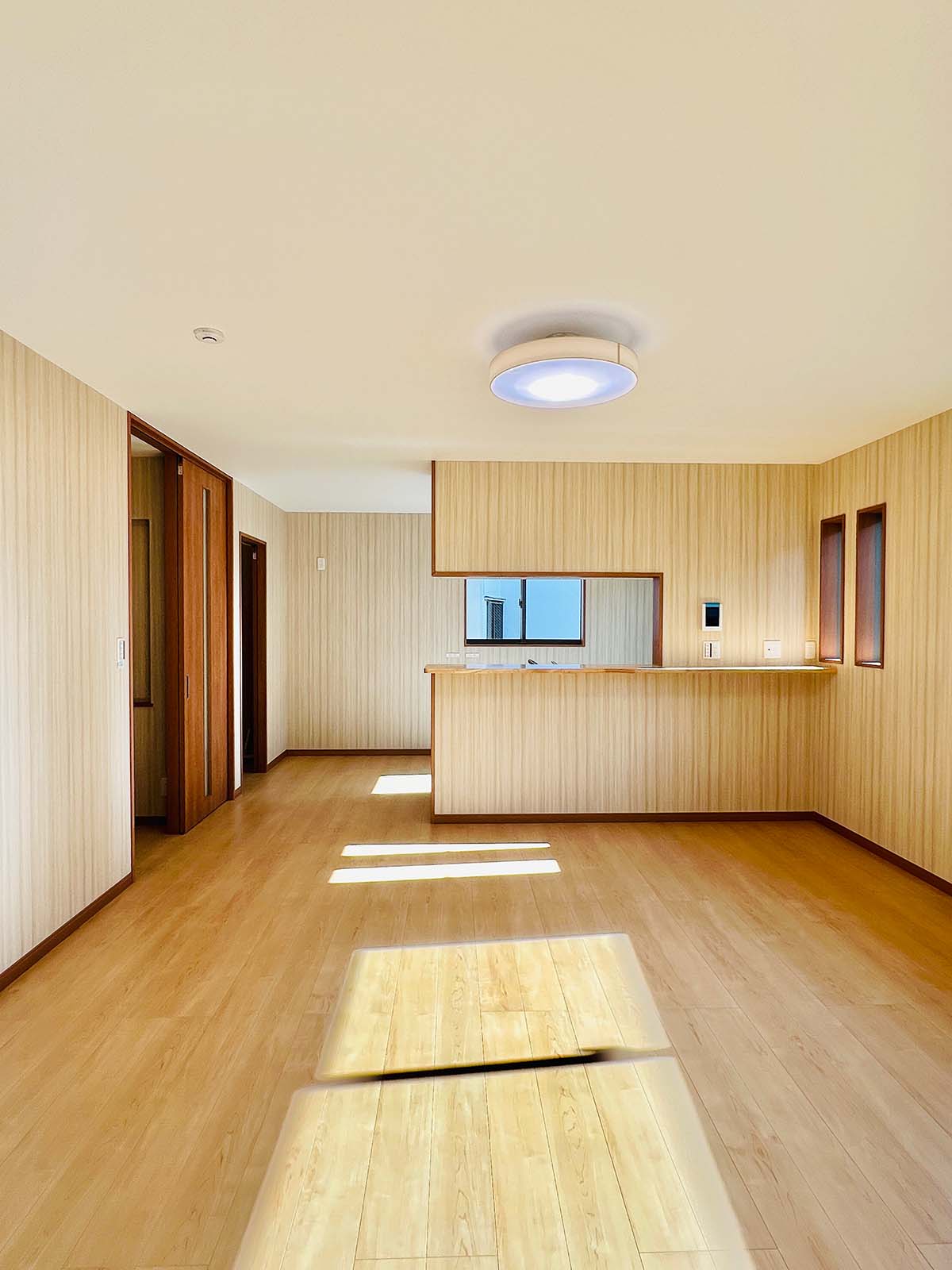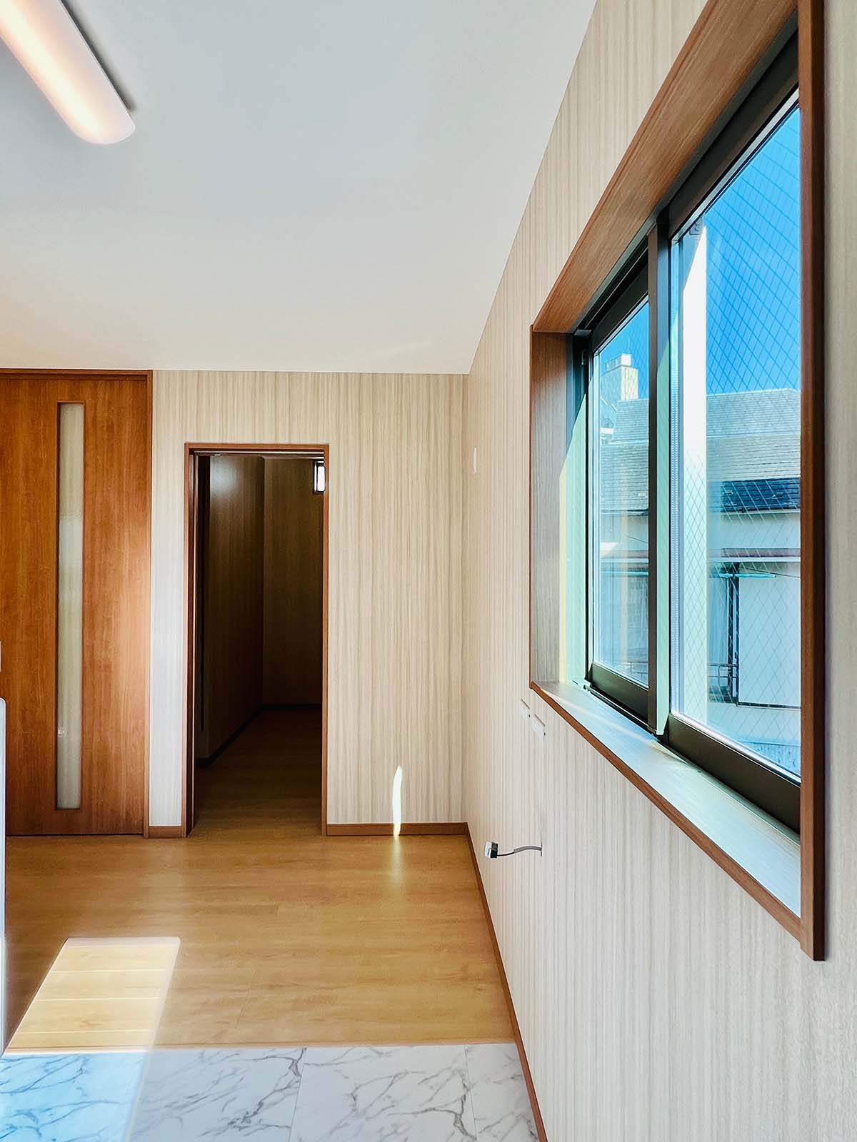 内装は、やや和風を思わせる落ち着いた壁紙と照明でありながら、和室はなく、モダンな木目の床と扉を使用。昔ながらの温かい雰囲気を取り入れつつ新しさと調和した、居心地の良い家です。