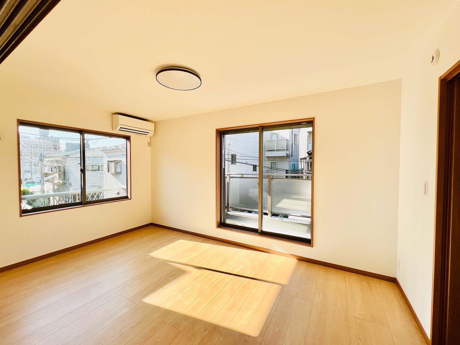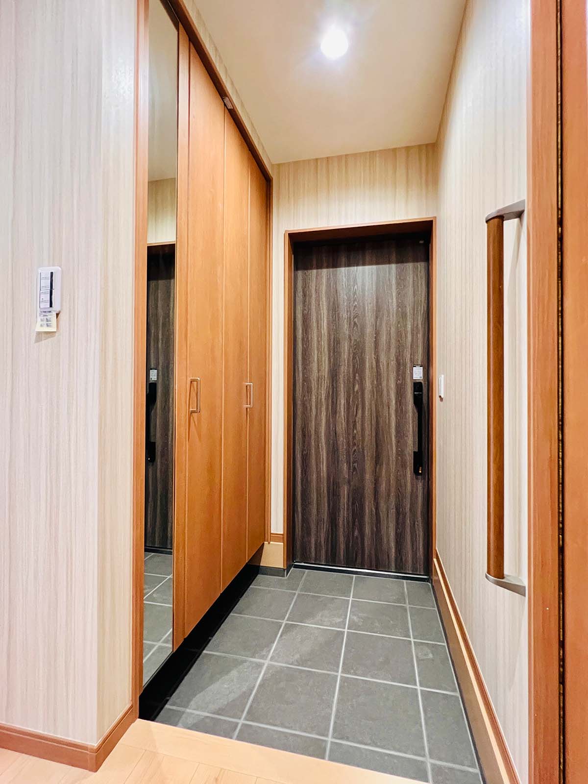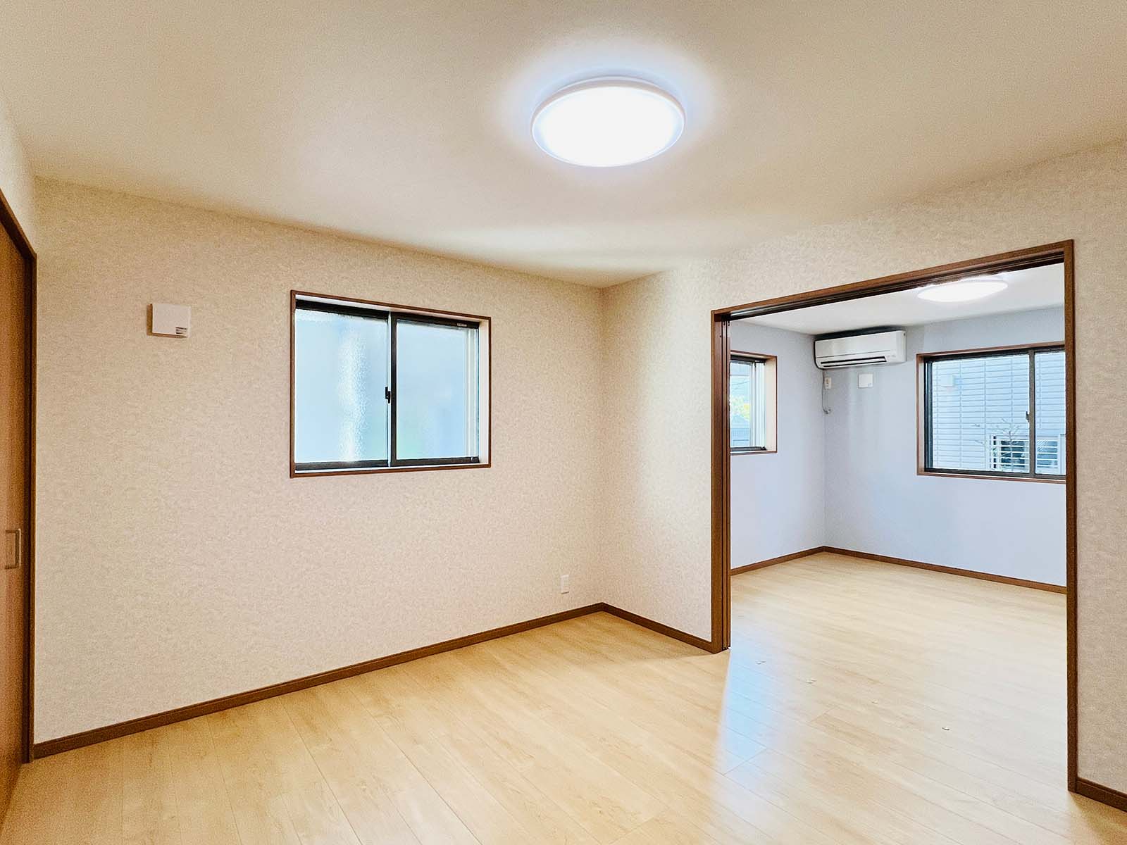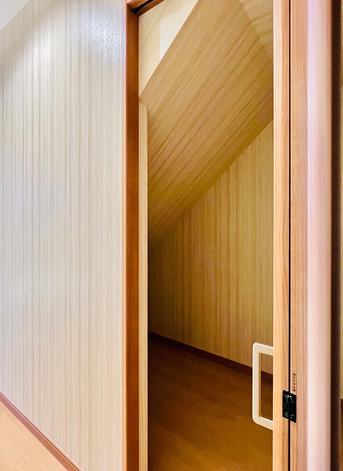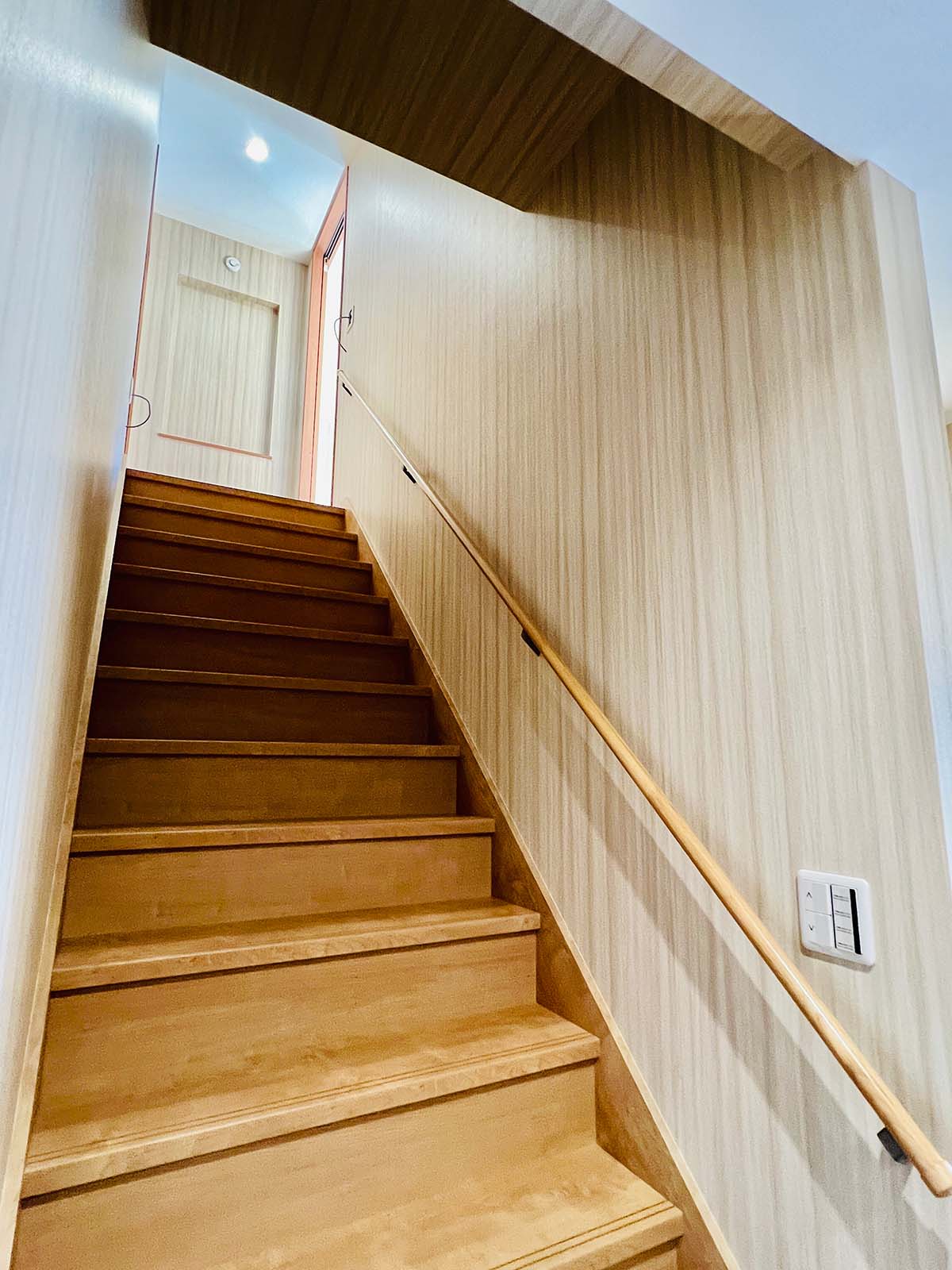 内装は、やや和風を思わせる落ち着いた壁紙と照明でありながら、和室はなく、モダンな木目の床と扉を使用。昔ながらの温かい雰囲気を取り入れつつ新しさと調和した、居心地の良い家です。