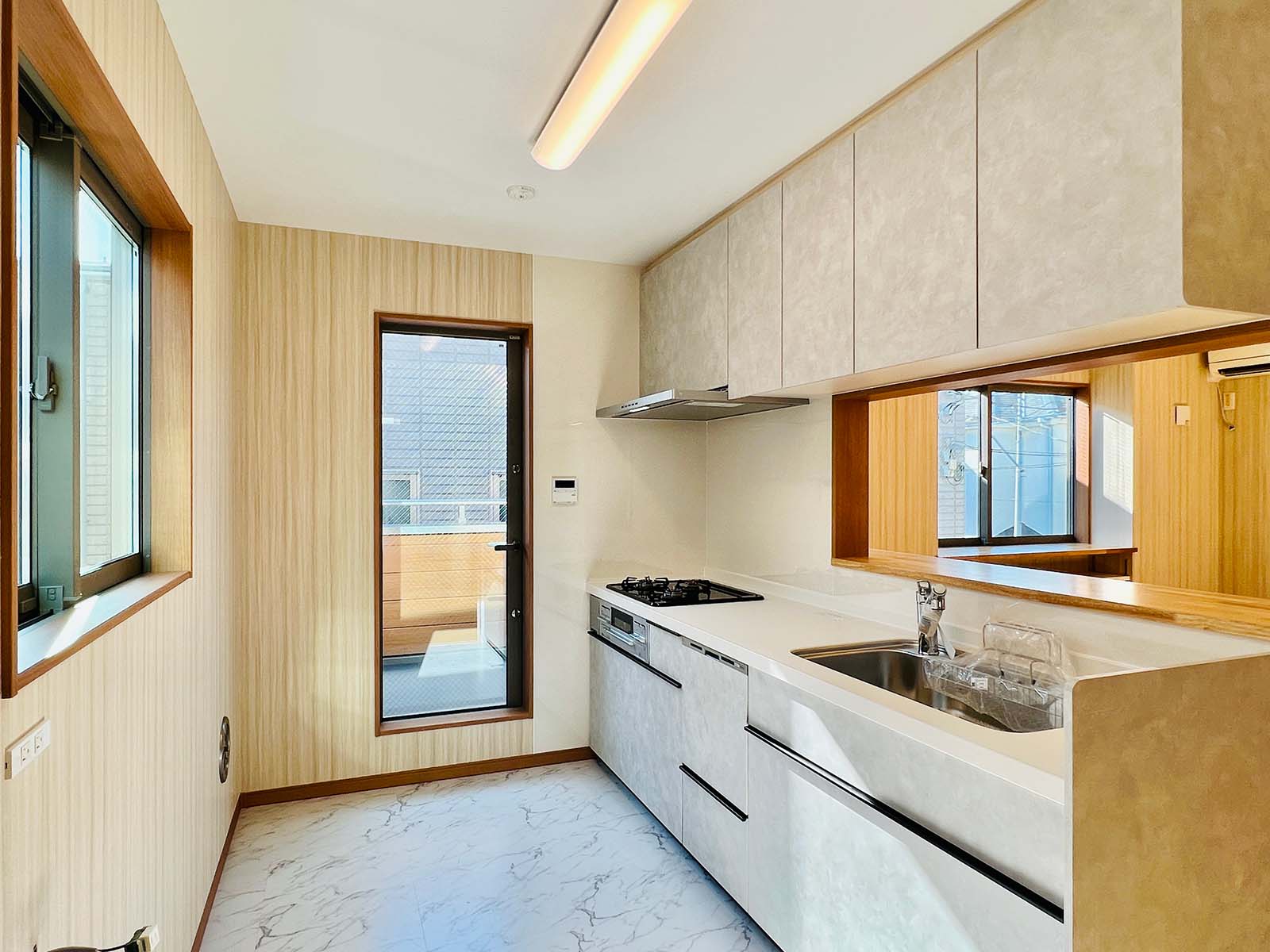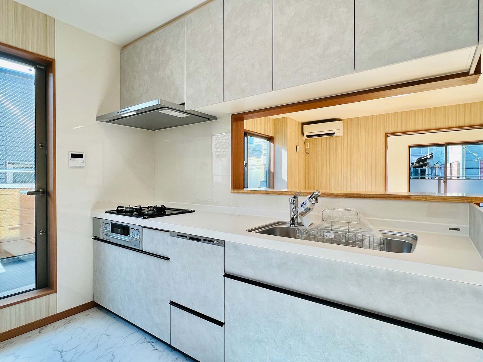 キッチンは対面で、リビングを見渡せます。キッチンカウンターの高さは85cm程度が標準ですが、昔ながらの80cmを採用し、やや低めで家事を楽に。家全体の床はフローリングなのですが、キッチンの床は大理石に見えるシートを使用。上品に見えて足元が寒くなく固くない、長く立っていても楽なキッチンを追求しました。キッチンからテレビを見ることも可能です。