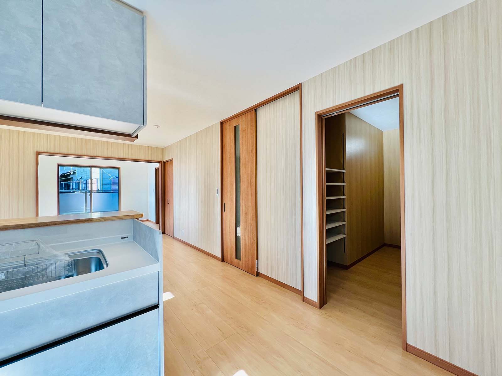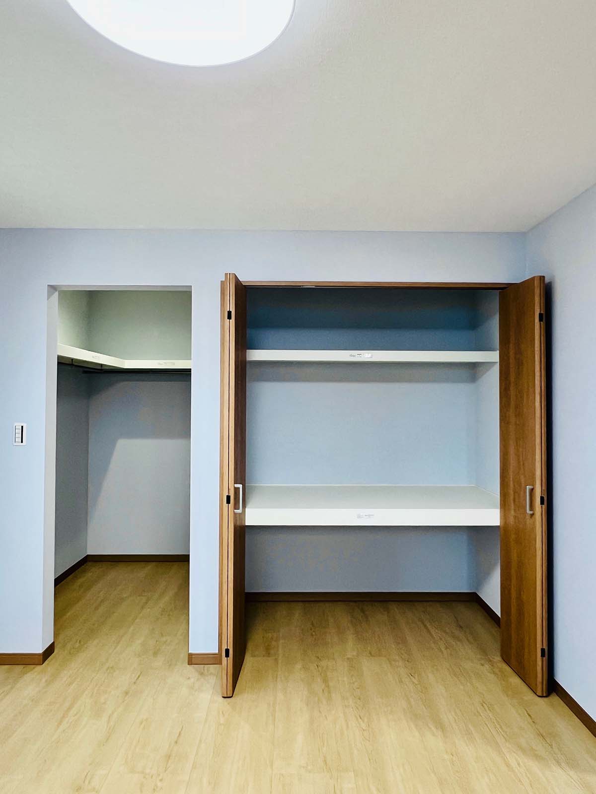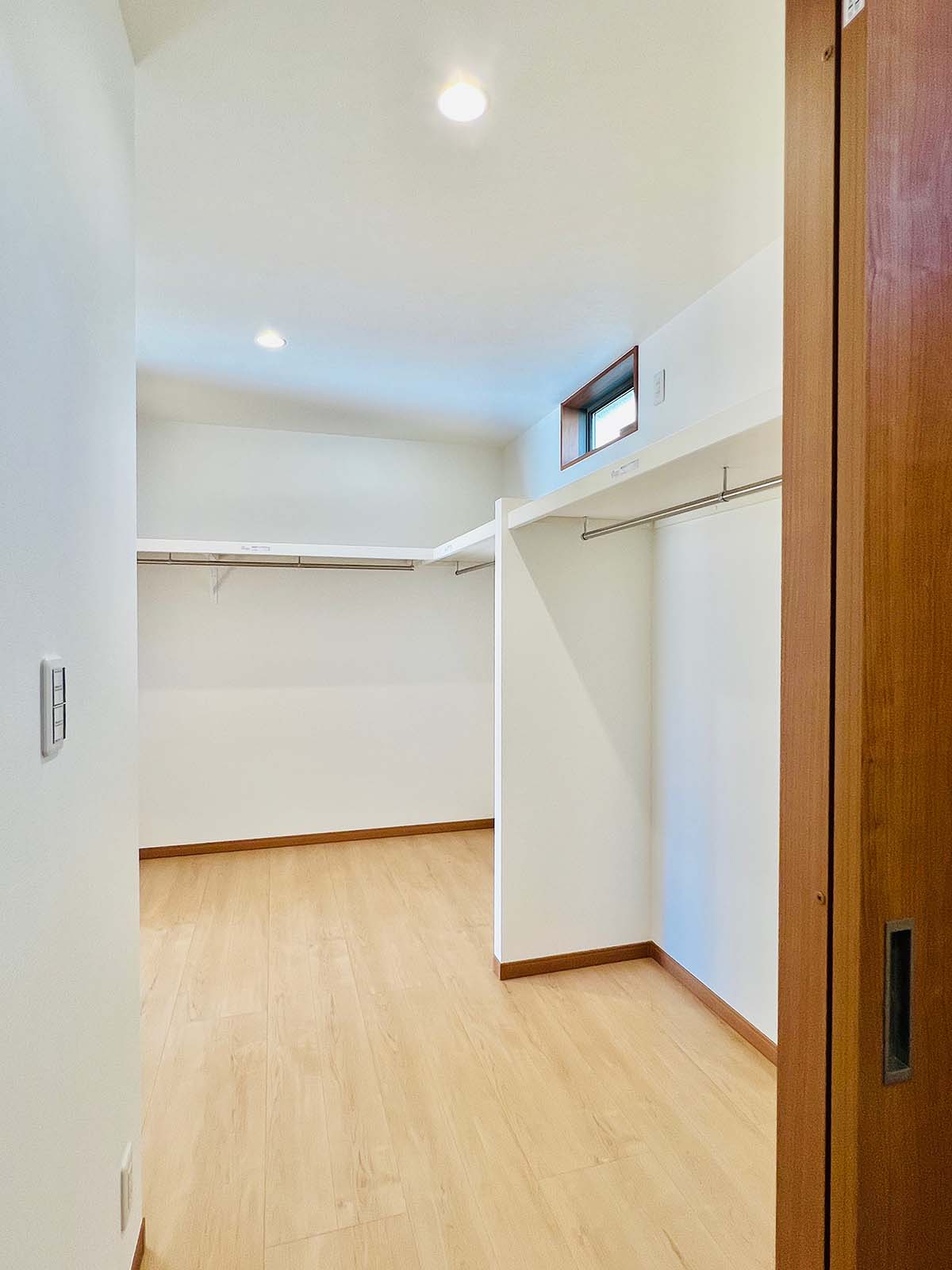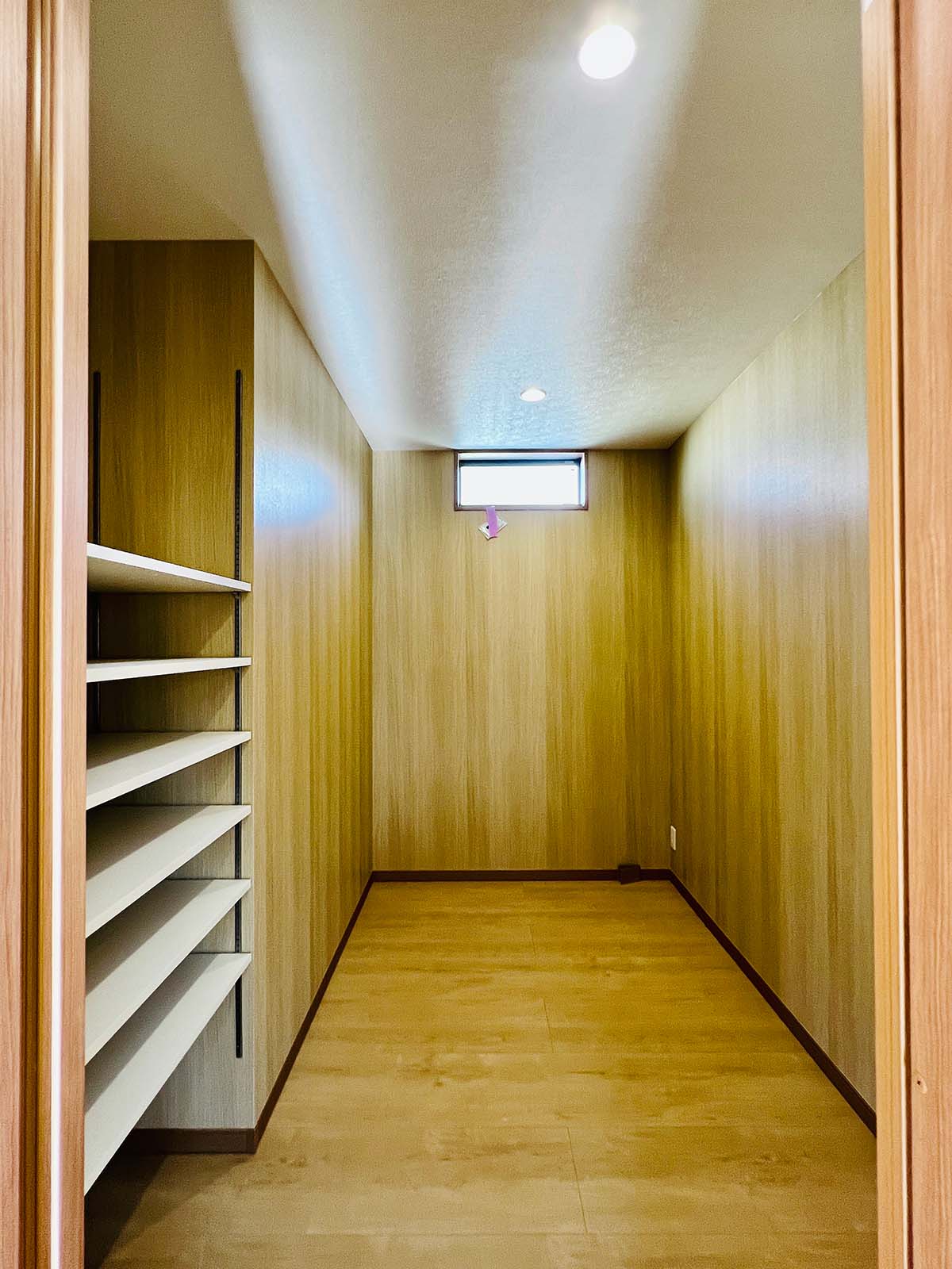 収納の多い家です。大きなウォークイン収納と、各部屋に大きめのクローゼットが付いています。キッチン脇には、これまた大きなパントリーが。小窓もついていて、風の流れが確保できています。
