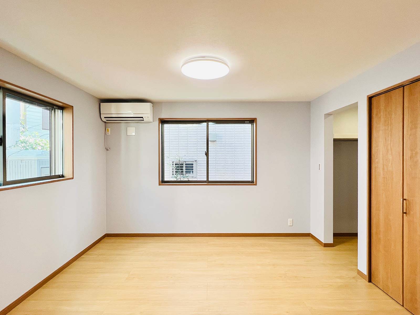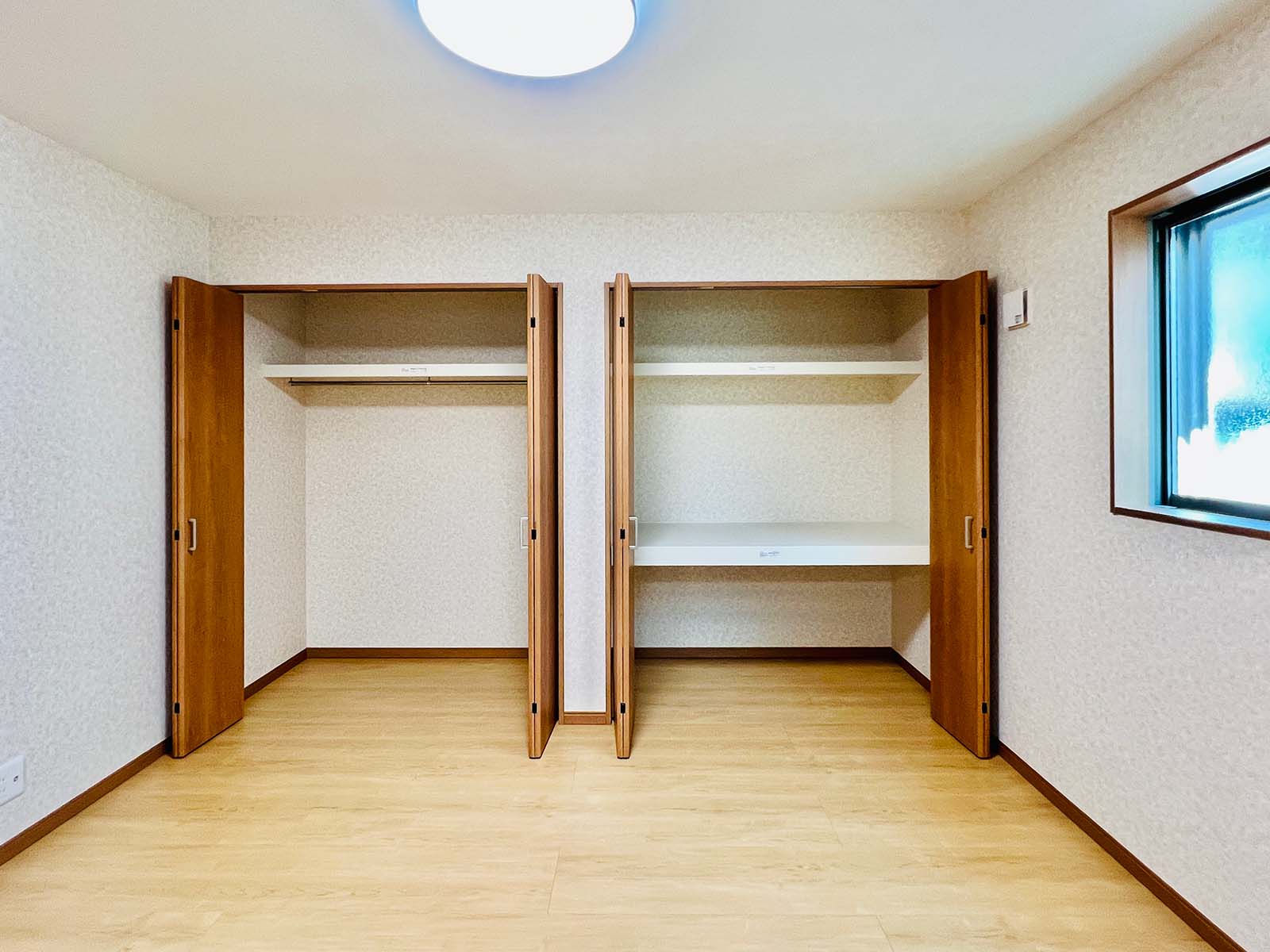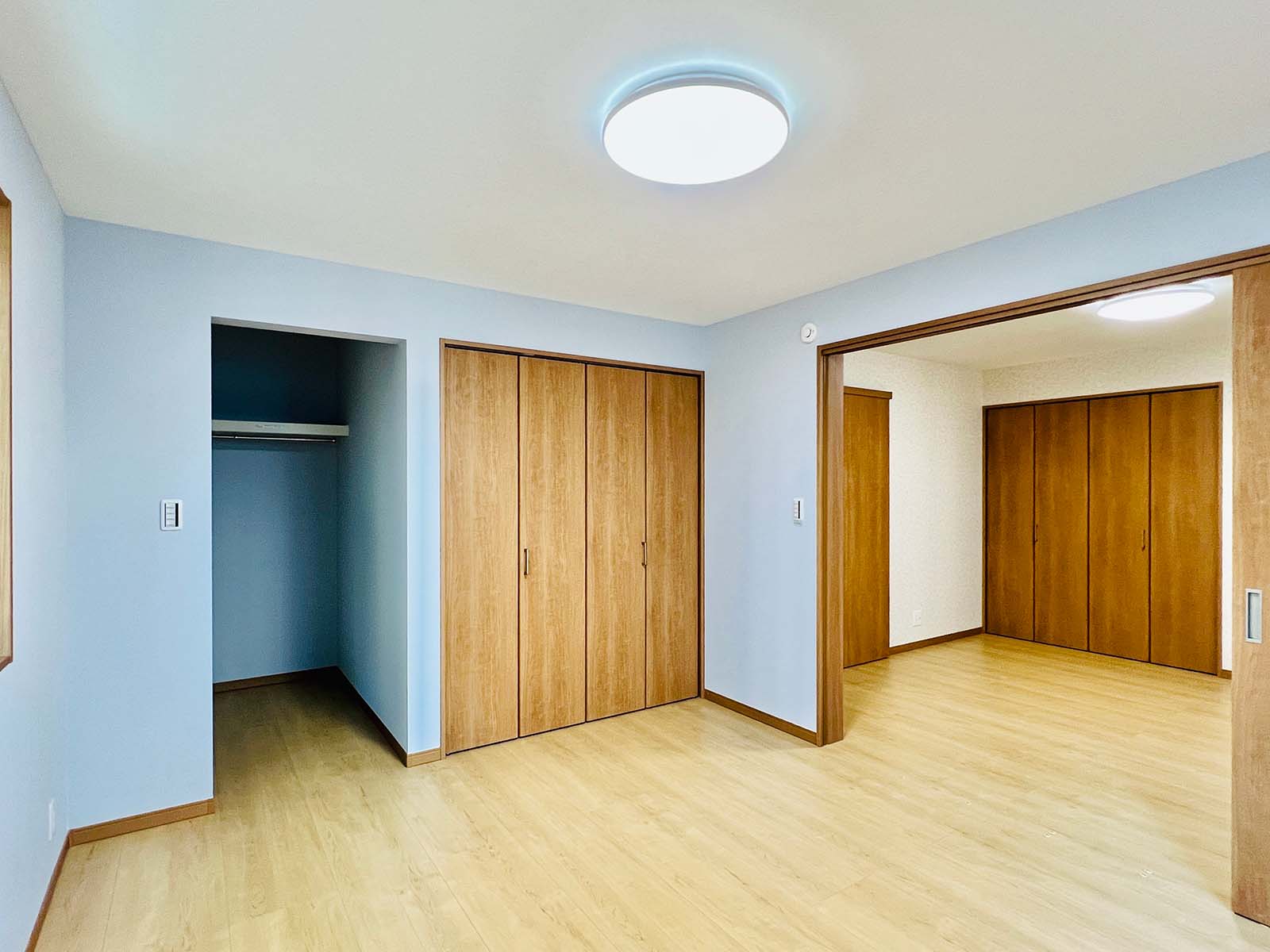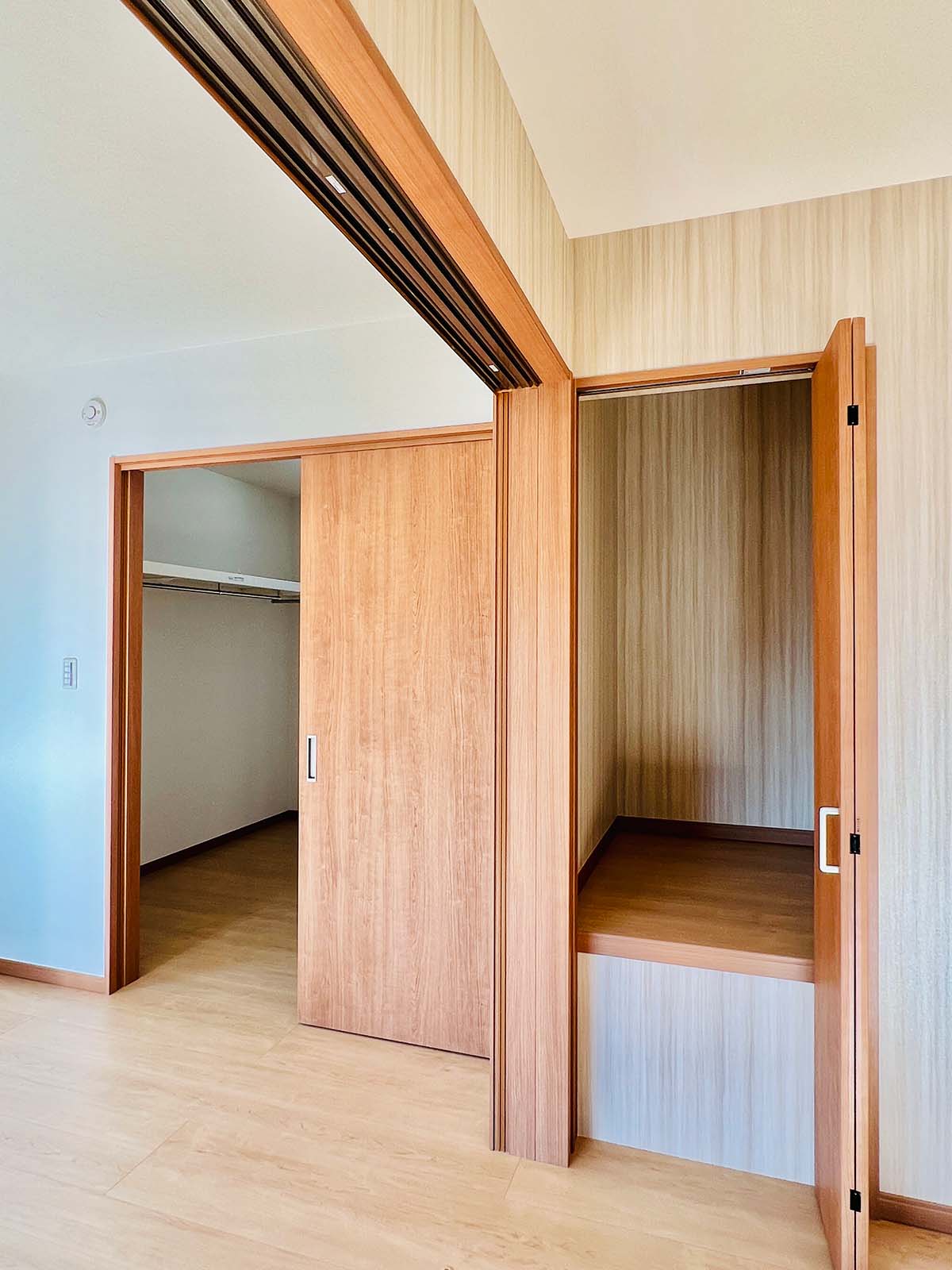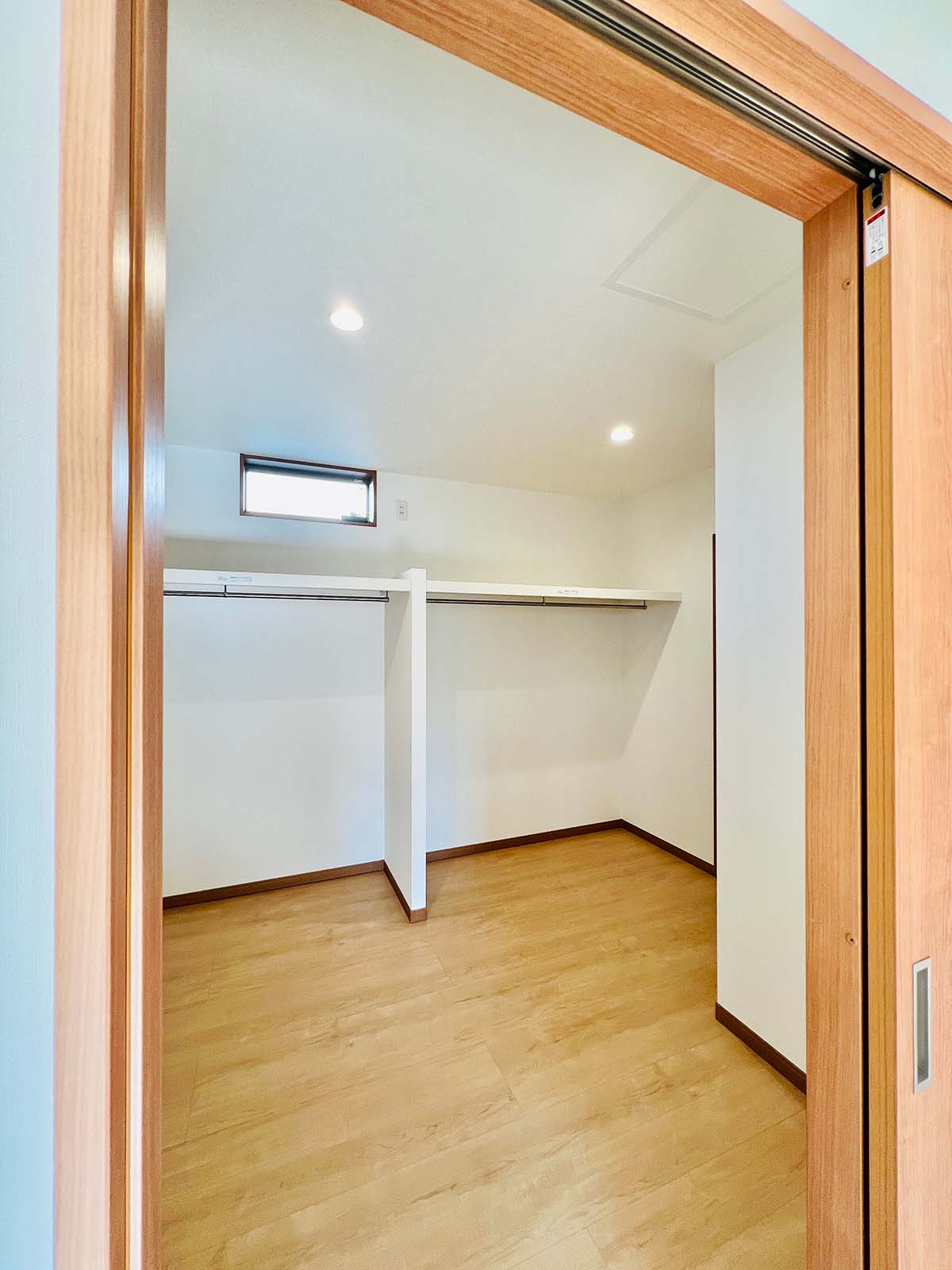 収納の多い家です。大きなウォークイン収納と、各部屋に大きめのクローゼットが付いています。キッチン脇には、これまた大きなパントリーが。小窓もついていて、風の流れが確保できています。