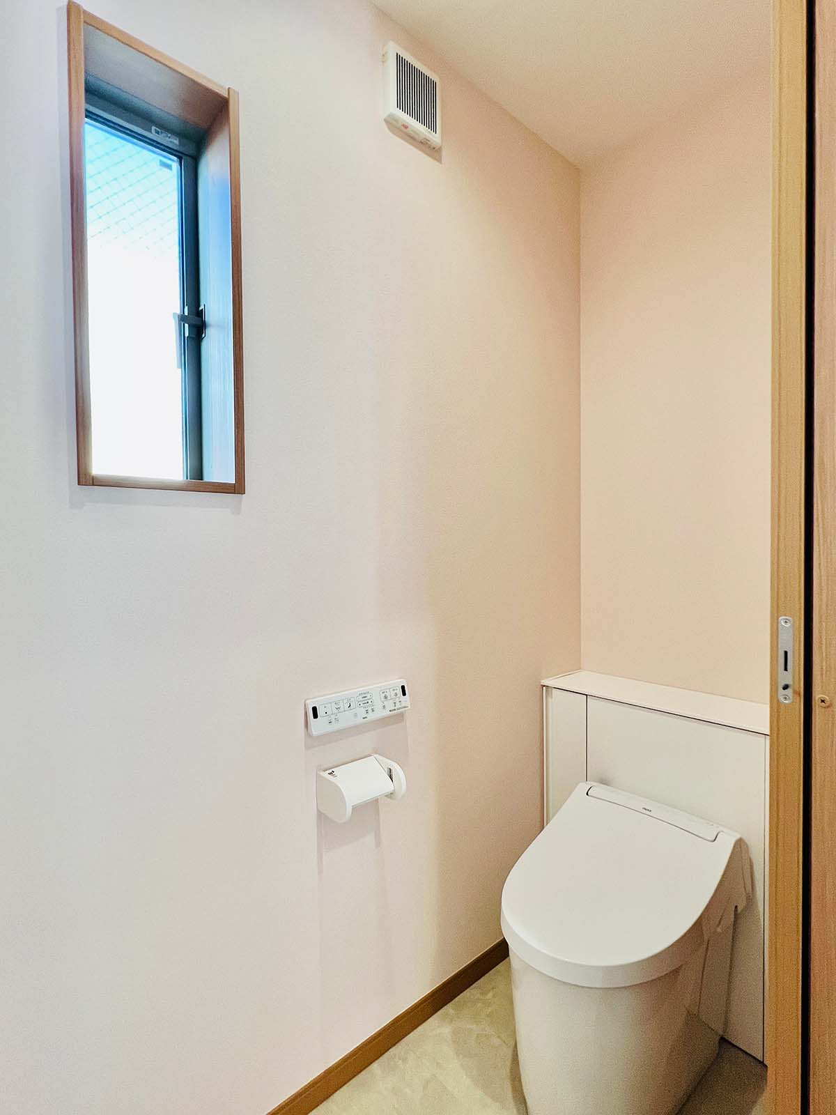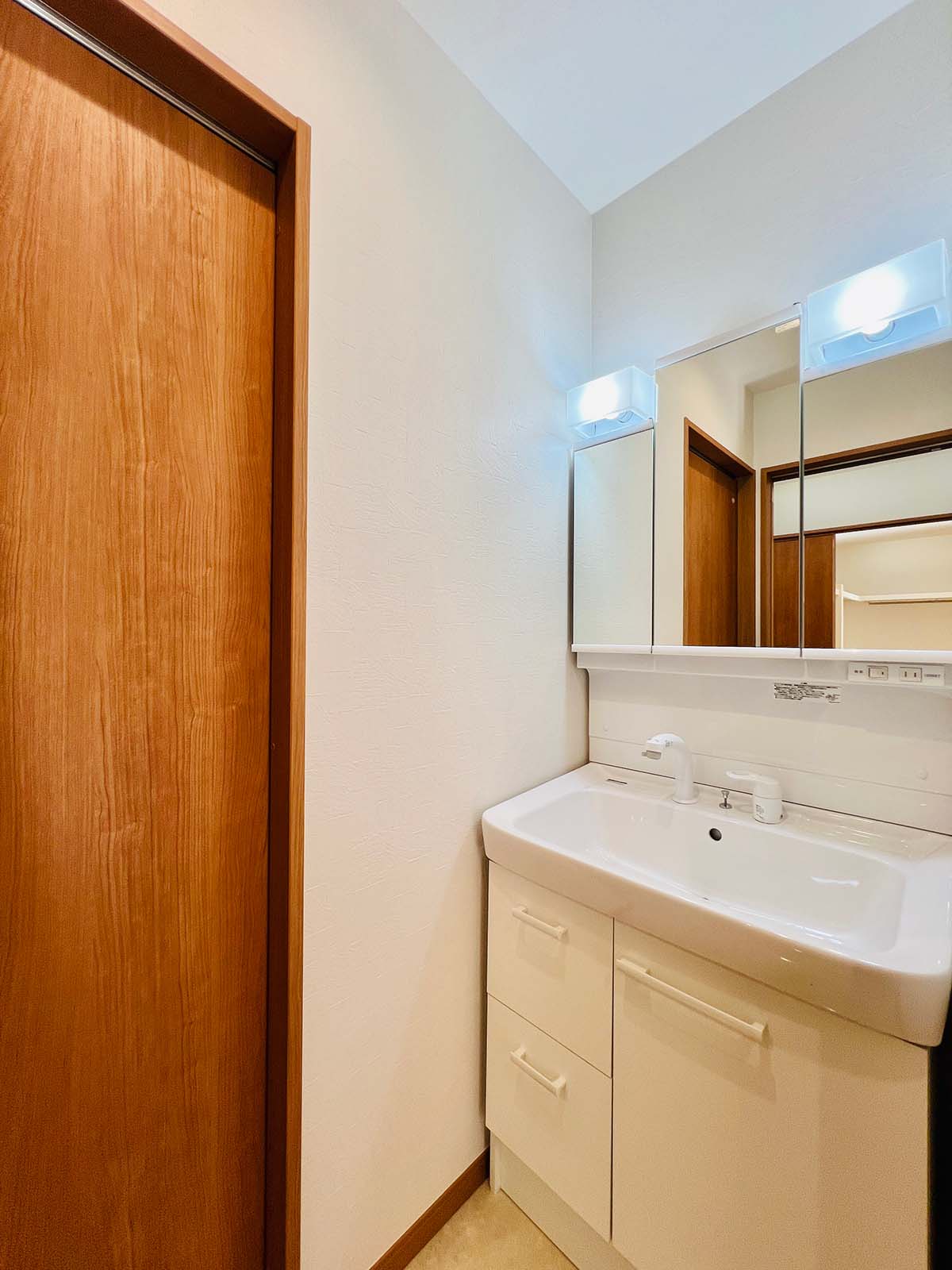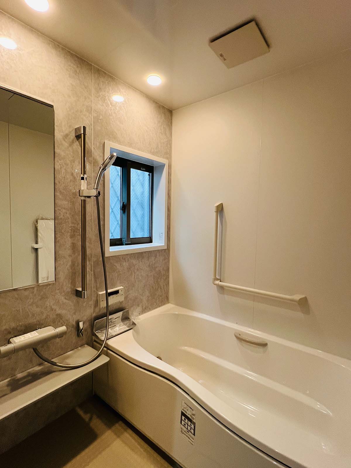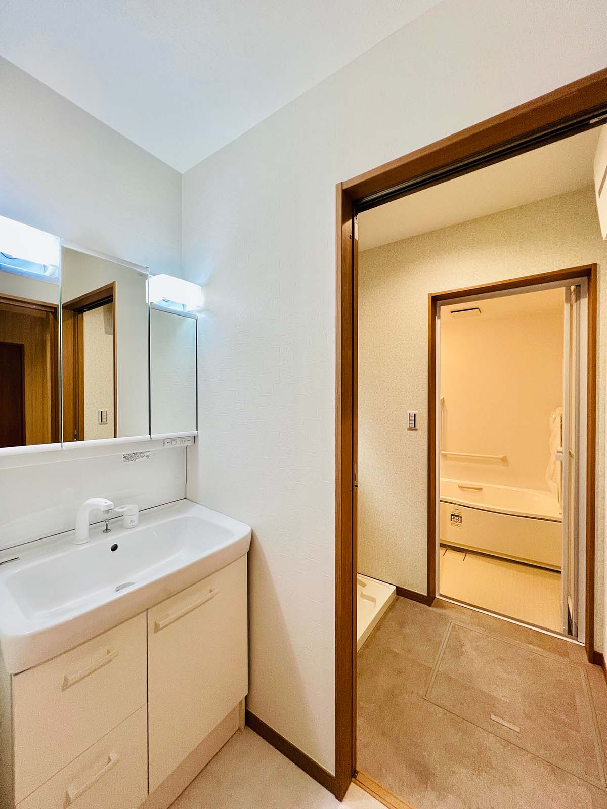 1階にも2階にも洗面トイレが。将来のことを考え、浴室は1階。バスタブは低めのものを採用。冷たくない床で快適に過ごせる浴室です。洗面所の床も大理石に見えるシートを使用していて、抜群の清潔感。